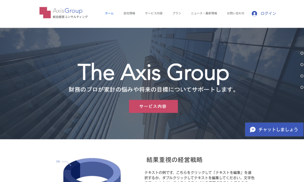 コンサルティング会社「Axis Group」を想定。企業の信頼性向上を目指し、会社の主要サービスを分かりやすく案内する。